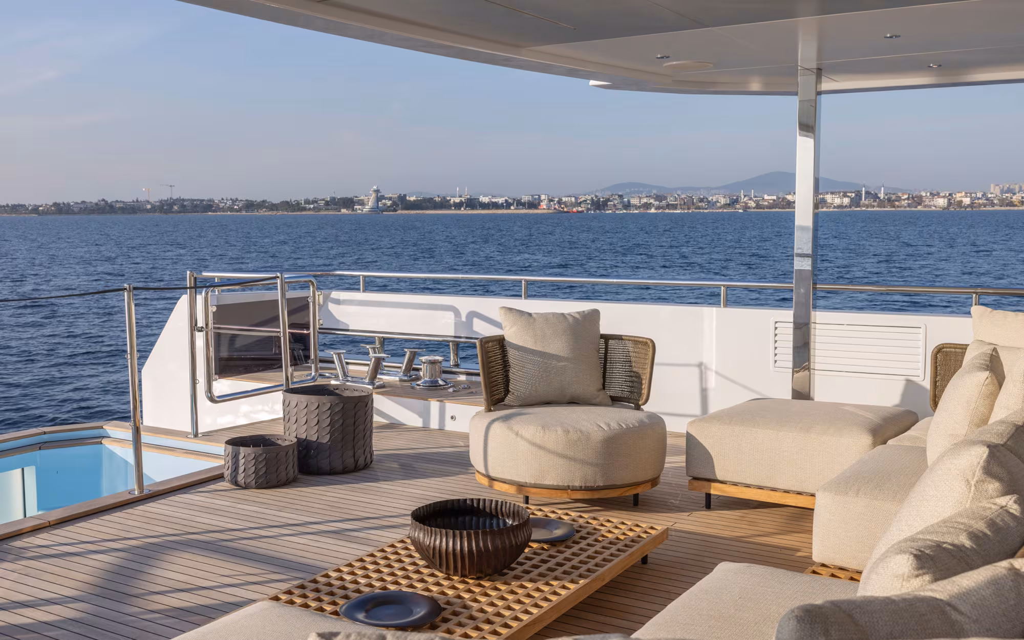 - Expansive sun deck and vast upper deck aft flowing into the bridge-deck salon