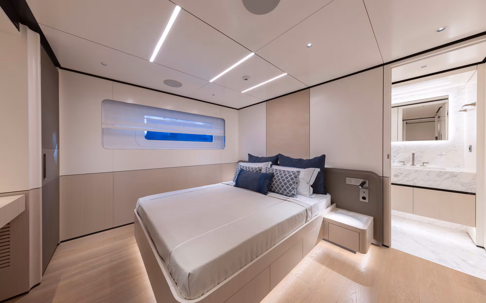 A robust, long-range steel displacement explorer with aluminium superstructure (just under 300 GT), BEE EXPLORER marries expedition capability with a sophisticated, contemporary interior. The full-beam owner’s stateroom on the main deck is complemented by four guest suites below, while generous exterior areas include a spacious sun deck, a vast upper deck aft flowing into the bridge-deck salon, and a main salon opening to an aft deck with Jacuzzi, Med-steps, and a large fixed bathing platform.