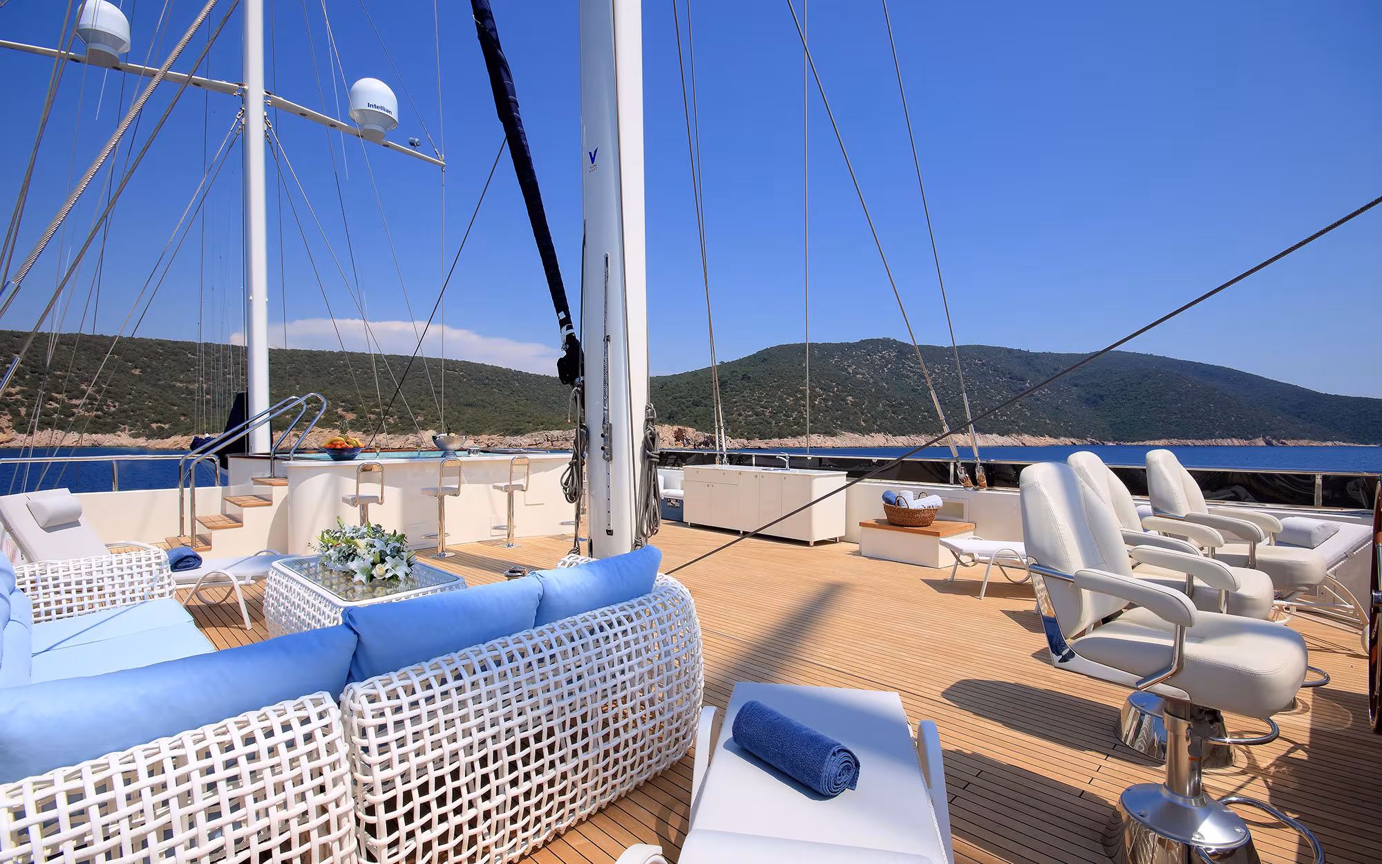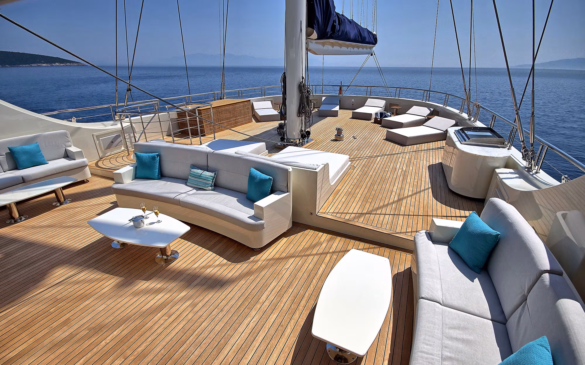 MEIRA brings the feel of a private resort to a true sailing platform: a main-deck master suite paired with beautifully appointed guest cabins (all with smart home controls), generous salons inside and out, and a wellness core of sauna, Jacuzzi, and onboard therapist. Designed by Evan K. Marshall and built by Neta Marine, she balances style with substance – quiet, capable propulsion, a thoughtful toy set for every pace, and seamless spaces for formal dining or barefoot afternoons under sail – making her a standout for luxurious East Med cruising.